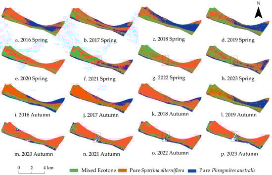 From 2016 to 2023, the mixed ecotone in Chongming Dongtan wetland showed a general trend of expansion, with marked seasonal differences between spring and autumn, as detailed in Table 5 and shown in Figure 6.