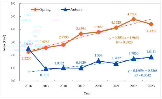 Spatiotemporal dynamics of the mixed ecotone in Chongming Dongtan: expansion trends and seasonal patterns (2016–2023). The dashed lines represent the linear regression trend for spring (2016–2023) and the polynomial regression trend for autumn (2017–2023), respectively.