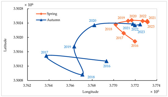 Centroid migration analysis shows the spatial evolution of the mixed ecotone, as shown in Figure 7. A general seaward migration of the mixed ecotone was observed in spring (mean azimuth: 112°), indicating a seaward expansion trend. The centroid migrated at a higher rate between 2016 and 2019, averaging 219.20 m per year. This was followed by a deceleration between 2020 and 2023, with the average annual displacement decreasing to 70.70 m and accompanied by periodic oscillations. These patterns suggest possible regulation by hydrological resistance or interspecific competition. The autumn migration trajectory showed greater complexity, with a net displacement of 1068.80 m and a mean orientation of N17.0°E. The trajectory progressed through three phases: an initial southwestward retreat (2016–2018), likely reflecting post-disturbance recovery heterogeneity; a northeastward shift in 2019; and sustained northeastward expansion (2020–2023), which showed directional alignment with spring migration patterns.