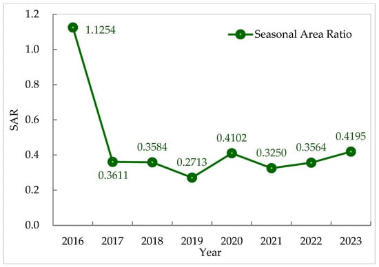 To quantify seasonal competitive dynamics within the vegetation community [49], the Seasonal Area Ratio (SAR) was defined as the ratio of ecotone area in autumn to that in spring within the same calendar year. This metric serves as an indicator of phenology-mediated competition by reflecting shifts in the relative spatial dominance of the two species across seasons.