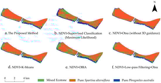 These findings indicate that near-infrared reflectance captures the phenological differences between P. australis (higher reflectance) and S. alterniflora (lower reflectance) in spring. In contrast, NDVI shows the strongest discriminatory power during autumn, a period characterized by the distinct phenological contrast between senescent P. australis and still-verdant S. alterniflora. Therefore, near-infrared reflectance and NDVI were selected as the optimal spectral indices for spring and autumn, respectively. The corresponding thresholds were then used to classify the complete time-series dataset.