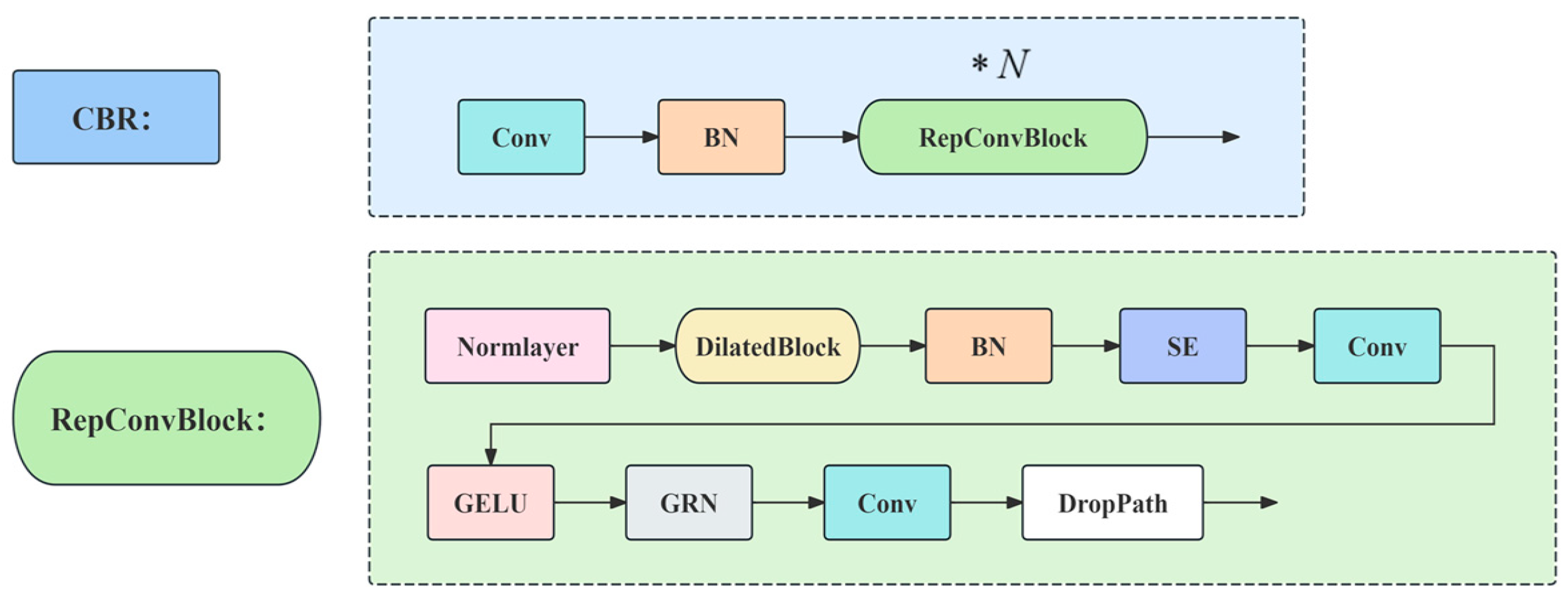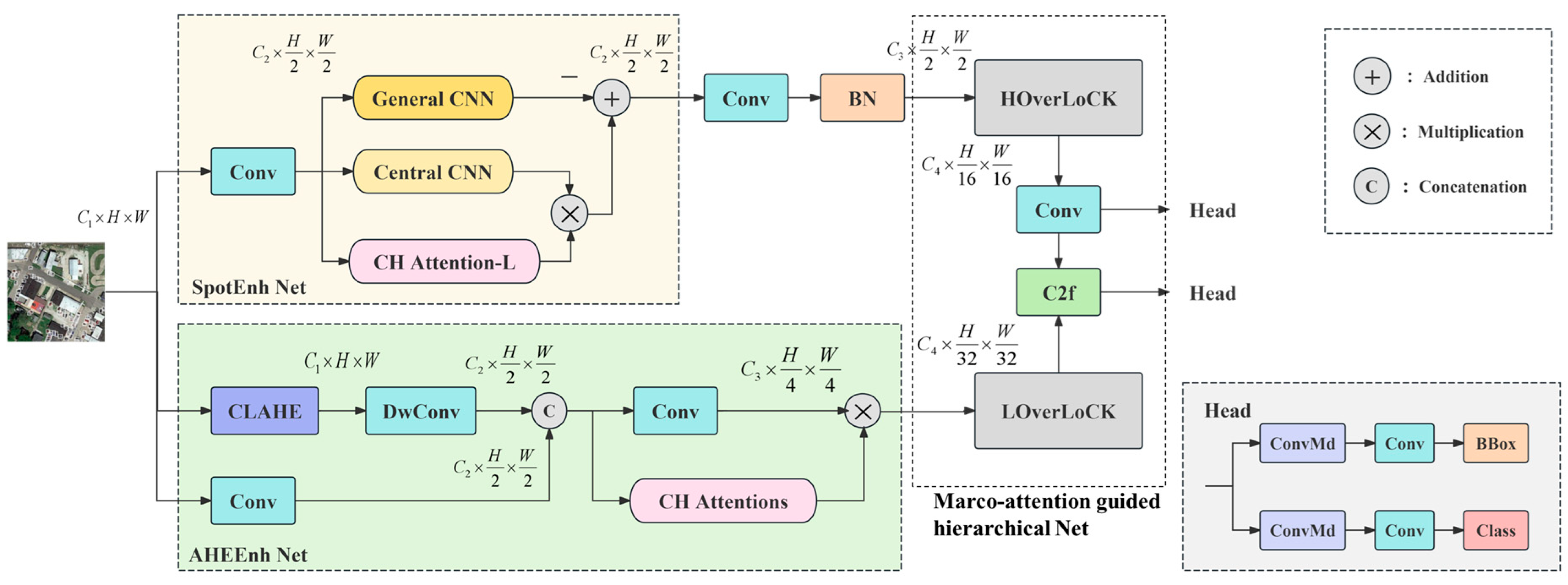 - Detailed feature extraction guided by macroscopic structural features: Drawing on the backbone network of OverLoCK [16], which utilizes a hierarchical architecture, our method uses macroscopic spatial structural features to guide and align local detailed features crucial for identifying small targets. This creates a feature extraction structure for local small targets that operates under the guidance of macroscopic structural features. This top–down, context-guided approach ensures that local feature extraction is focused on salient regions, improving accuracy and efficiency.