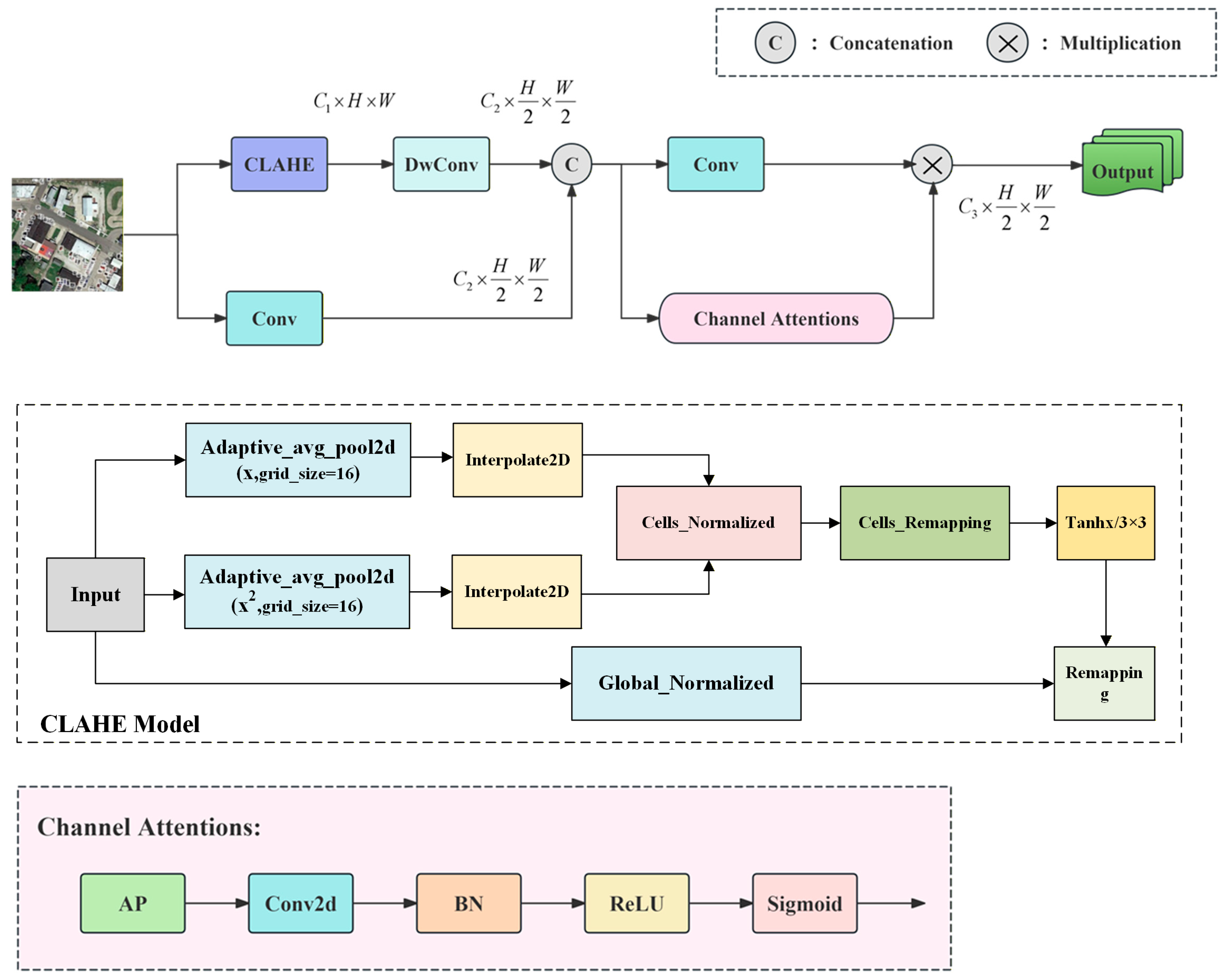 - Weak target pattern adaptive enhancement: The local adaptive enhancement algorithm is introduced to enhance the weak contrast structure of the target and improve the model’s ability to learn weak contrast features. Depthwise separable convolution (DWConv) [26] is integrated to facilitate channel-wise pattern expansion and to filter for beneficial feature channels, ultimately enhancing the structural representation ability of target features.