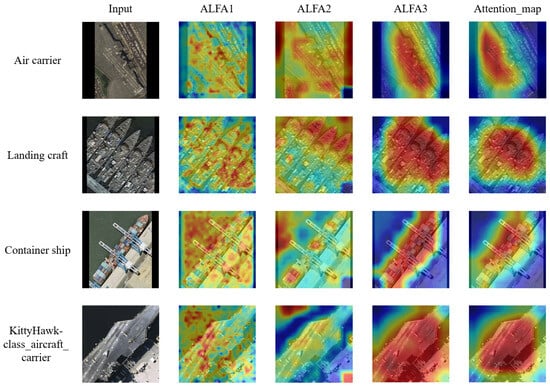 The visualization results in Figure 9 elucidate the hierarchical and integrative attention mechanism of the proposed MA-Net. The multi-scale ALFA modules generate attention maps that operate at distinct feature resolutions, embodying a coherent progression from local saliency to global semantics.ALFA1 functions on the highest-resolution feature map (e.g., ), producing activations that pinpoint fine-grained local details. As shown in the second column, its focus is granular, highlighting textural patterns, sharp edges, and small structural elements on the ship’s hull or superstructure. This level of detail provides the foundational cues for distinguishing subtle inter-class variations. ALFA2 operating on a medium-resolution feature map (e.g., ), shifts attention to mid-level discriminative parts. Its activation maps, shown in the third column, cover larger contiguous regions corresponding to functional components of the ship, such as distinct sections of the deck, the bridge structure or cargo handling equipment. This represents an aggregation of local features into semantically meaningful parts. ALFA3 works on the coarsest feature map (e.g., ), capturing holistic target-level semantics. Its activations, depicted in the fourth column, encompass the entire object or its major subsections, providing contextual understanding and shape priors. This global view ensures that the model maintains structural coherence and suppresses attention to irrelevant background regions.