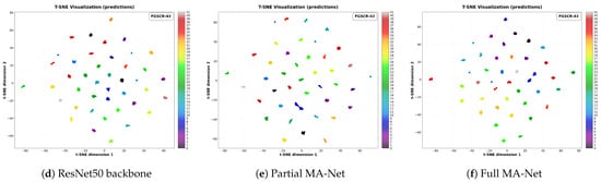 T-SNE visualization of feature distributions on the FGSC-23 (first row) and FGSCR-42 (second row) datasets. (a,d) ResNet50 backbone, (b,e) partially ablated MA-Net, and (c,f) full MA-Net model. The full MA-Net exhibits clearer inter-class separation and tighter intra-class clustering on both datasets.