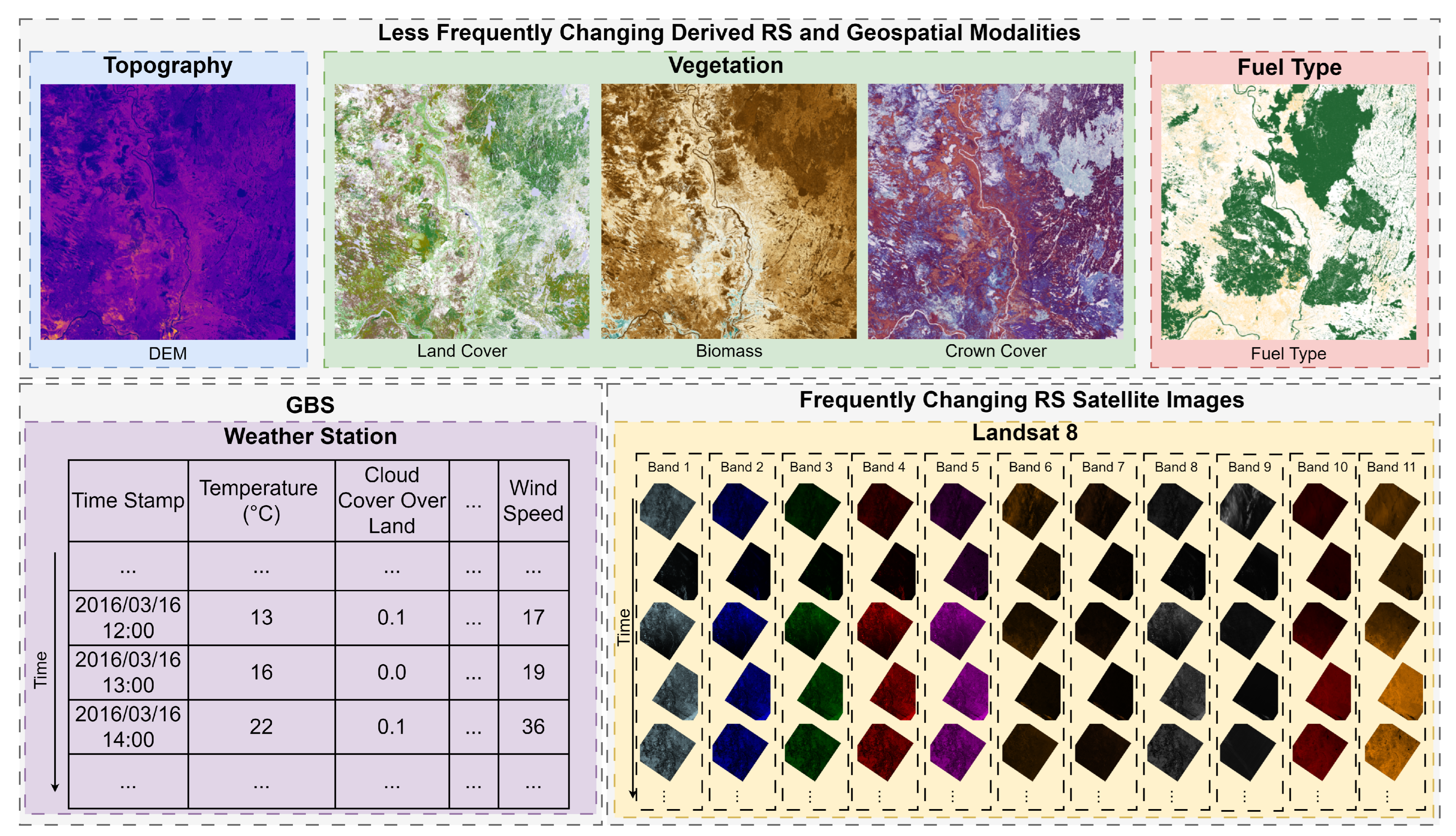 | NOAH (Our) | Canada (Expandable to Worldwide) | 40,000 | 8,742,469 | 2013–2025 | Fine (30 m) | 1 h | 234,089 | Topography, Vegetation, Satellite, Fuel, and GBS | Soft Sensors, Super-Resolution, Cloud Removal, GM, etc. |