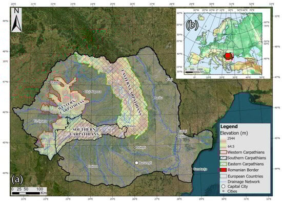 The Romanian Carpathians represent the most extensive sector of the Carpathian orogenic system, extending for approximately 910 km, about 54% of the range’s total length and encompassing 66,303 km2, accounting for 40.9% of the total Carpathian area and 27.8% of Romania’s national territory [27]. The Romanian Carpathians are conventionally subdivided into three major units, each characterized by distinct physical–geographical conditions: the Eastern Carpathians (33,584 km2), the Southern Carpathians (15,000 km2), and the Western Carpathians (17,714 km2) [27].