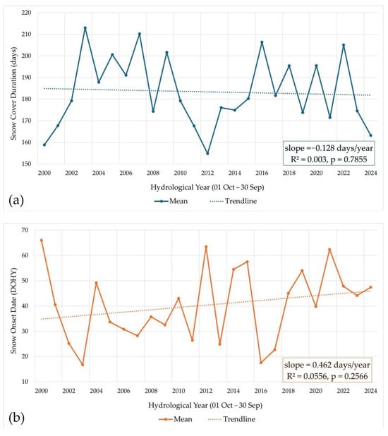 Snow presence was identified using the widely applied threshold of NDSI ≥ 0.4 [38], which is generally appropriate for 500 m MODIS snow products [39,40]. In the MOD10A1F dataset, the CGF_NDSI_Snow_Cover layer is provided as a scaled integer (0–100) [20]; therefore, the snow criterion was applied to the product’s scaled values as NDSI ≥ 40 (equivalent to NDSI ≥ 0.4 in the conventional −1 to 1 range) [36]. Based on this classification scheme, pixel-wise daily series were assembled for each hydrological year (1 October–30 September) and used to compute three phenology metrics: (i) snow cover duration (SCD), defined as the number of snow days per hydrological year [41]; (ii) snow onset date (SOD), defined as the first day of the snow season; and (iii) snow end date (SED), defined as the last day of the snow season [42].
