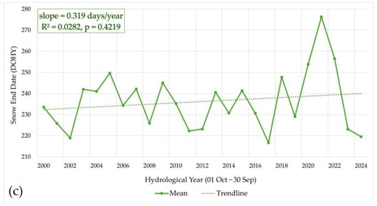 For SED, interannual values typically range from day 220 to day 270, indicating that snowpacks often persist into late May or June. The fitted trendline suggests a slight delay in melt-out (+0.32 days yr−1; R2 = 0.028; p = 0.422), which is not statistically meaningful.