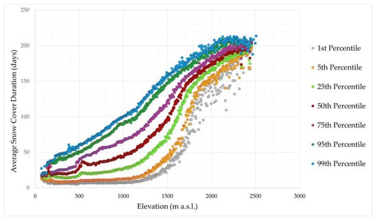 To quantify how snow persistence varies with elevation across the Romanian Carpathians, the full SCD dataset was stratified using a fine-resolution hypsometric binning approach. The elevation range was divided into contiguous 5 m intervals, and all MODIS grid cells whose elevations fell within each interval were aggregated. For each 5 m band, the distribution of SCD values for the 2000–2025 period was summarized using the 1st, 5th, 25th, 50th (median), 75th, 95th, and 99th percentiles (Figure 8). This approach provides a consistent and statistically robust representation of both the central tendency of snow duration (median) and the magnitude of interannual variability (lower and upper percentiles) along the hypsometric gradient.