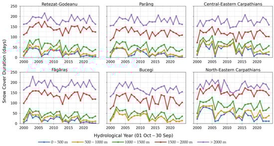 SCD time series for the six main high-mountain groups of the Romanian Carpathians, aggregated into 500 m elevation bands (2000–2025). The plots highlight marked contrasts between the Southern and Eastern Carpathians.