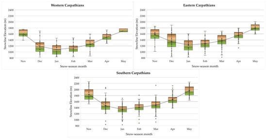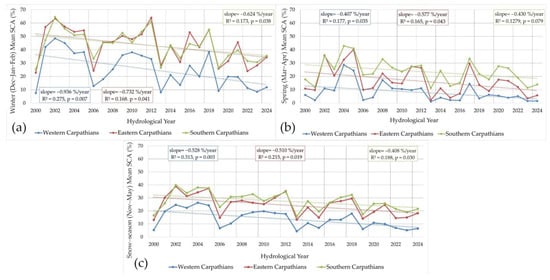 To complement pixel-wise phenology metrics with domain-level diagnostics, we derived snow-covered area (SCA) and a snowline elevation (SLE) indicator for the three major Carpathian units (Western, Eastern, Southern). SCA was computed for each hydrological year as the fraction of the analyzed area classified as snow (NDSI ≥ 40) and aggregated to seasonal windows aligned to the regional snow regime: winter (December–February), spring (March–April), and the full snow season (November–May). For each unit and seasonal window, we constructed interannual SCA series and evaluated linear trends using ordinary least squares regression, reporting slope (% yr−1) and associated fit statistics. To characterize the seasonal migration of the snowline, we combined the snow classification with FABDEM elevations and, for each month of the snow season (November–May) and hydrological year, extracted the elevations of snow-covered pixels within each unit to derive a representative SLE indicator for that month–year. Monthly SLE variability across the study period was summarized using box-and-whisker statistics (median, interquartile range, 1.5 × IQR whiskers, and outliers), enabling comparison of the typical mid-winter lowering and spring rise of the snowline among units.