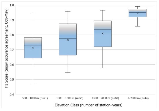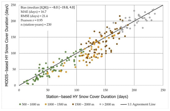 To quantify uncertainty in MODIS-derived snow metrics, we validated satellite-based estimates against several climatic parameters available for Romania during July 2014–September 2025. Daily snow depth data were extracted from MeteoManz (https://www.meteomanz.com/index?l=1, last accessed 24 January 2026), which compiles land SYNOP alphanumeric messages and BUFR observations (WMO standard formats). Using 26 stations spanning 586–2504 m a.s.l. (Table S1), each station was paired with the nearest MODIS 500 m pixel, and both datasets were aggregated to hydrological years. For each station–year, SCD was computed consistently from daily snow presence, and station–MODIS agreement was quantified using Pearson correlation, MAE, RMSE, and bias summarized as the median with interquartile range (IQR). Performance was reported overall and stratified by elevation class. In addition, day-to-day snow occurrence agreement over the snow season (October–May) was evaluated using the F1 score, defined as the harmonic mean of precision (the fraction of MODIS snow days that are also snow at the station) and recall (the fraction of station snow days correctly detected by MODIS) and summarized by elevation class. For phenology timing, station-based SOD and SED were derived using the same 5-day persistence rule applied to MODIS to ensure comparability; timing differences were summarized using bias and MAE by elevation class.