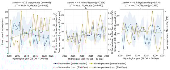 SOD anomalies (Figure 6b) exhibit pronounced interannual variability, alternating between early- and late-onset years. The linear trend suggests a slight, statistically non-significant delay of +0.28 days per year (R2 = 0.036, p = 0.364). Positive anomalies, reflecting earlier onset, occur in 2000, 2010, 2020, and 2022, whereas negative anomalies—indicating delayed onset—characterize periods such as 2001–2002, 2007–2008, and 2018–2019. Overall, the fluctuation amplitude, generally within ±10 days, highlights irregular snow onset timing without evidence of a systematic shift in the start of the snow season.