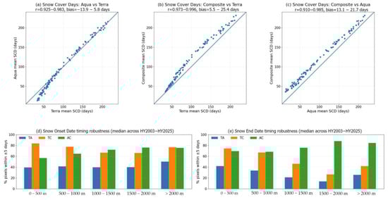 To evaluate the potential influence of platform sampling and illumination differences on derived snow metrics, we extended the workflow to include the MODIS/Aqua CGF snow product and a Terra–Aqua daily composite over the common Aqua availability period (1 October 2002–30 September 2025). Daily, study-area-clipped GeoTIFF time series were generated for Aqua using the same preprocessing steps as for Terra, and a corresponding Terra–Aqua composite was produced for each overlapping date. Using each of the three daily inputs (Terra-only, Aqua-only, composite), we recomputed SCD, SOD, and SED using identical thresholds and persistence rules. Agreement among approaches was assessed through pairwise comparisons of the resulting metric fields (e.g., correlation- and bias-based summaries) and by evaluating the consistency of SOD/SED timing across elevation classes, providing a robustness check on the Terra-only configuration used for the main analyses.
