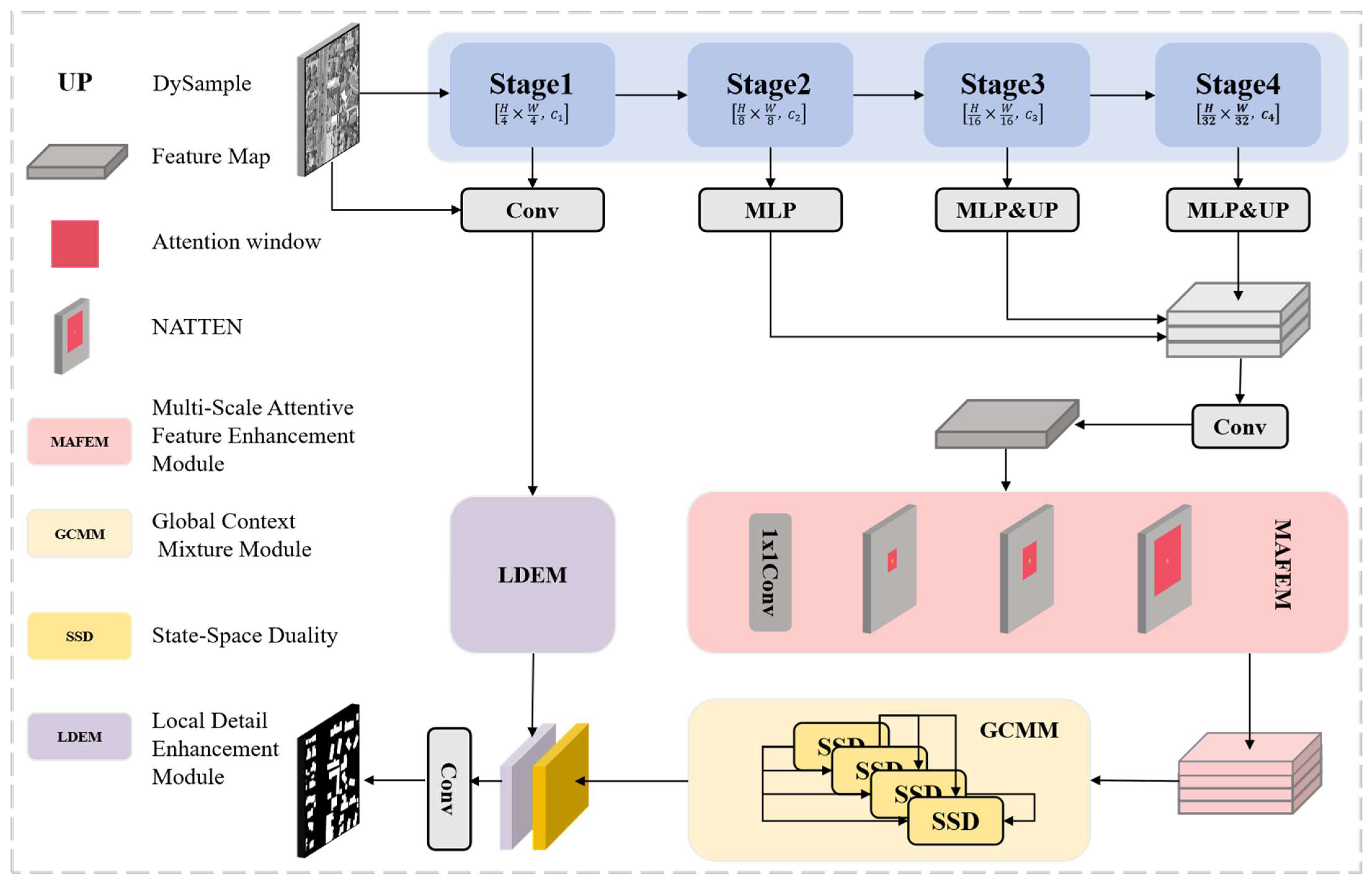 - Through the design of three major modules, our method jointly optimizes global semantic understanding, local detail recovery, and multi-scale context awareness within a unified framework. This not only overcomes the performance bottlenecks of conventional CNNs or Transformers in remote sensing building segmentation but also provides an efficient and transferable general paradigm for other high-resolution ground object segmentation tasks.