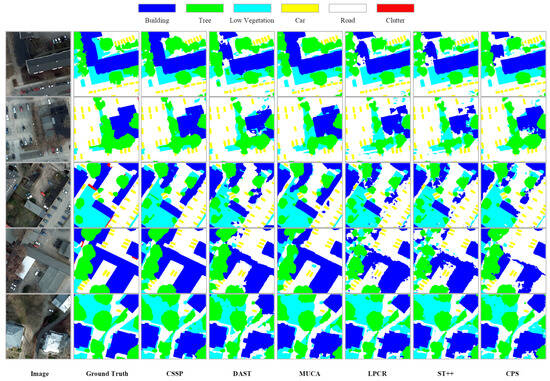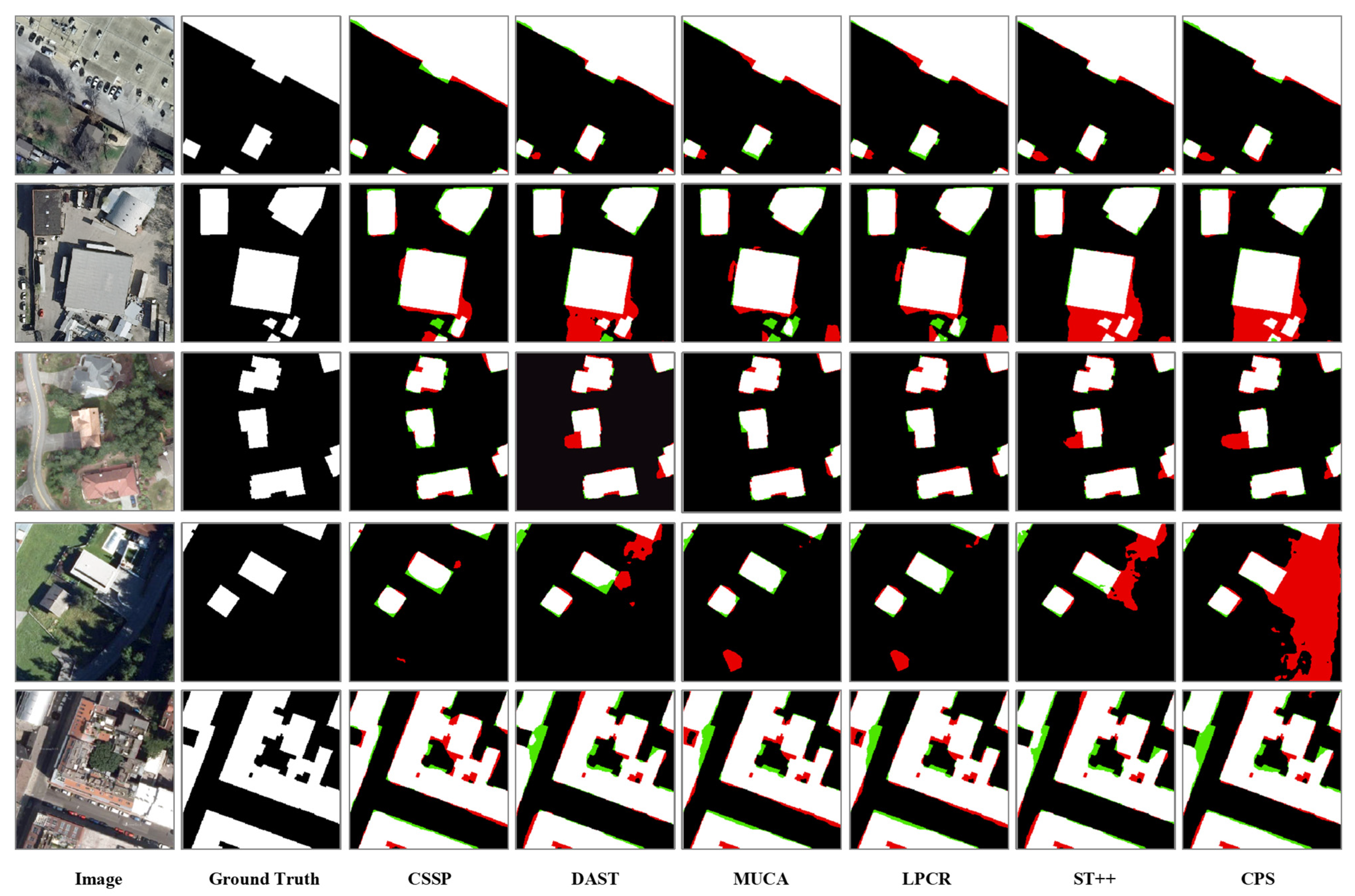 - Comparison between different types of methods: First, similarly to the Pot2Vai case, UDA methods perform significantly worse than SSDA methods, further confirming that SSDA has greater research potential and practical value than UDA. Second, existing SoTA SSDA methods fail to surpass even the SSDA baseline. This can be attributed to the superior cross-domain feature representation capacity of the ViT-based backbone—a capability that is typically lacking in CNN-based architectures. Third, our proposed CSSP method significantly outperforms all existing SoTA SSDA methods, even though it cannot see labeled data in the source domain compared with SSDA methods. However, CDCSSP-3 only slightly surpasses the CSSP by a margin of 0.12% in mIoU. A plausible explanation for this marginal gain is the limited volume of source domain data (only 210 images in Vaihingen), which may restrict the additional performance contribution that domain adaptation can provide over the SSL approach.