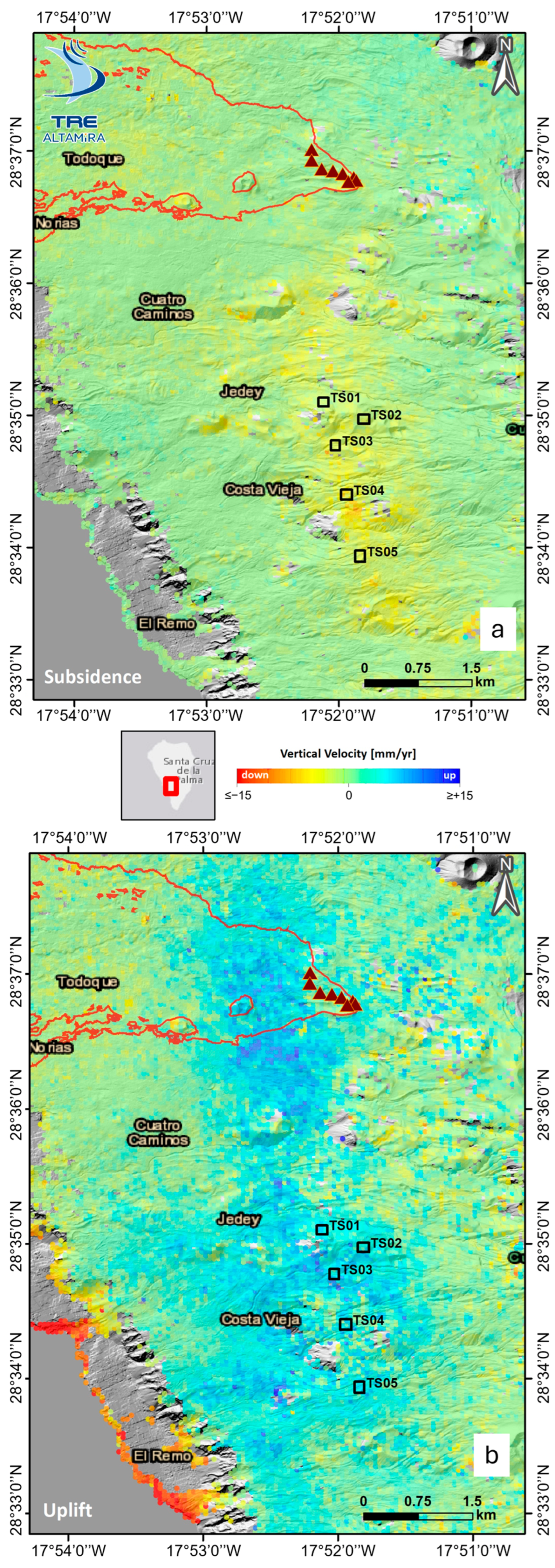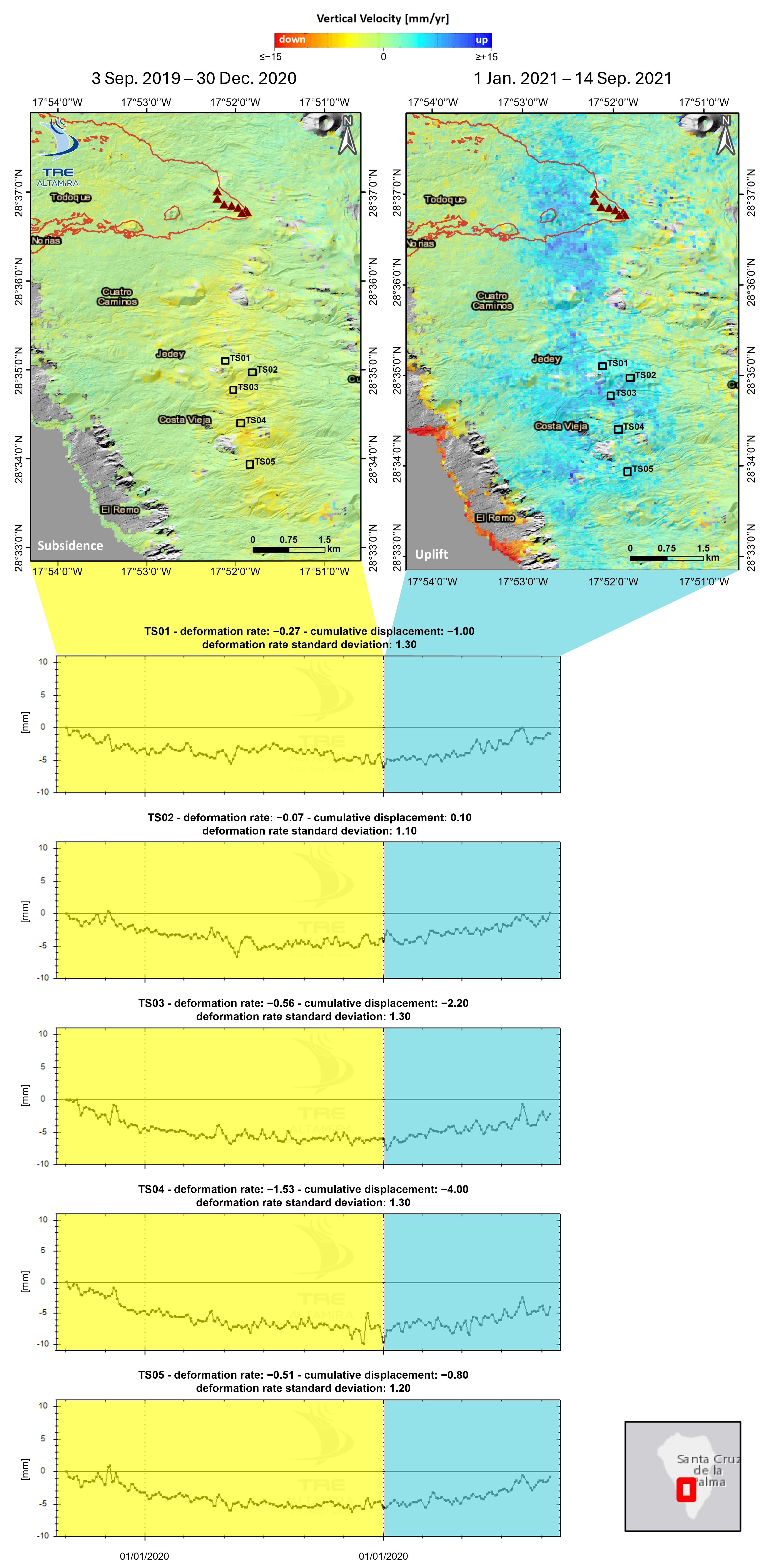 - Fernández, J.; Escayo, J.; Hu, Z.; Camacho, A.G.; Samsonov, S.V.; Prieto, J.F.; Tiampo, K.F.; Palano, M.; Mallorquí, J.J.; Ancochea, E. Detection of volcanic unrest onset in La Palma, Canary Islands, evolution and implications. Sci. Rep. 2021, 11, 2540. [Google Scholar] [CrossRef] [PubMed]