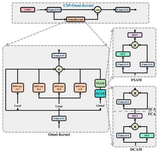 To alleviate the problem of information redundancy in feature fusion, we feed into CSP Omni-Kernel (CSPO) module, as illustrated in Figure 4. It consists of a global branch, a large-kernel branch, and a local branch. Specifically, the global branch extracts global contextual information using a dual-domain channel attention module (DCAM) and a frequency-based spatial attention module (FSAM). The large-kernel branch captures large-scale structural features via depth-wise convolutions with an extremely large kernel size. The local branch supplements fine-grained local details through pointwise depth-wise convolutions.