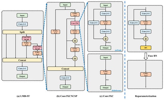 The LMB-FF module, as illustrated in Figure 5, implements a feature split, multi-branch processing, concatenation fusion workflow to enhance feature representation while balancing efficiency [43]. Specifically, the input feature map first undergoes dimensionality reduction via a 1 × 1 convolutional kernel, and is then split into multiple sub-feature maps through a split operation. These sub-feature maps are processed in parallel across three distinct branches: a 3 × 3 convolutional kernel branch integrated with the NCSP structure, a standard 3 × 3 convolutional kernel branch, and a combined branch consisting of Conv3XC-NCSP and 3 × 1 convolutional kernel. Notably, the Conv3XC-NCSP itself adopts a multi-branch parallel design, which includes a 3 × 3 convolutional kernel branch, a Conv3XC and 3 × 3 convolutional kernel branch, and another 3 × 3 convolutional kernel branch. The outputs of these internal branches are fused via element-wise addition. After processing, the outputs of all branches are concatenated, and the channel dimension is adjusted using a 1 × 1 convolutional kernel to generate the final output of the LMB-FF module.