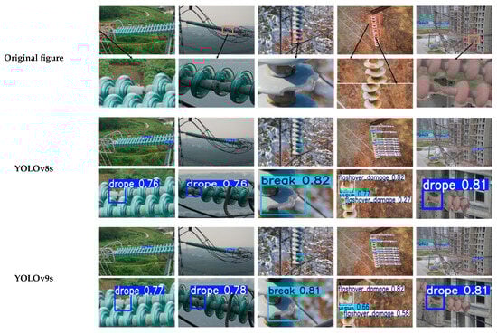 As presented in Table 6, the mAP@0.5 values from Experiment 2 to Experiment 7 demonstrate superior performance compared to the benchmark model (Experiment 1), indicating that the proposed improvements significantly enhance the effectiveness of insulator defect detection. In Experiment 2, the incorporation of the LMS-FE not only boosts detection accuracy but also substantially reduces both the number of parameters and computational complexity, with reductions of 39.9% and 44%, respectively, relative to the baseline model. This validates the effectiveness of the proposed enhancement strategy. In Experiments 3 and 4, the introduction of the SOEP feature pyramid and LMB-FF module leads to improved detection accuracy of small defective targets, while maintaining a parameter and computational load comparable to the benchmark model. In Experiment 5, the combination of LMS-FE and SOEP reduces the number of parameters and computational demands by 37.9% and 35.5%, respectively, further improving the model’s lightweight design. Experiment 6 demonstrates that by integrating LMS-FE and LMB-FF, the model’s ability to detect small-scale defective targets is significantly enhanced, resulting in a 1.8% improvement in the AP value for insulator defects, while reducing parameters and computation by 47% and 56.2%, respectively. This underscores the performance enhancement and computational efficiency achieved by LMB-FF module. Finally, Experiment 7, which integrates all of the aforementioned modules, achieves a detection accuracy of 96.1%, surpassing the baseline model by 2.2%. Simultaneously, the number of parameters and computational load are reduced by 44.9% and 47.1%, respectively, while the detection speed reaches 61.2 fps, meeting both the accuracy requirements for transmission line insulator inspection and the lightweight deployment constraints for edge devices.