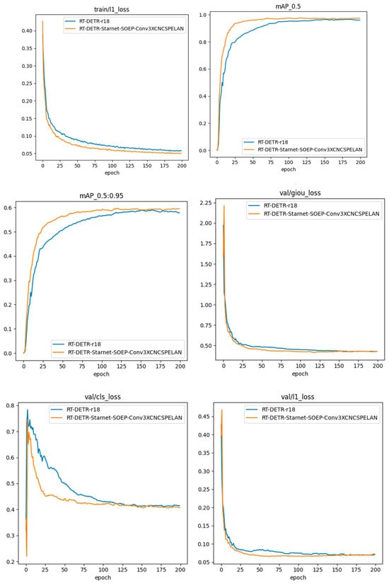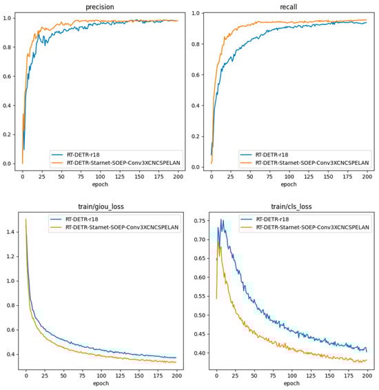 As shown in Figure 10, the improved model is evaluated against the baseline using four metrics—precision, recall, mAP@0.5, and mAP@0.5–0.95—as well as training and validation loss. The results indicate consistent performance gains across all metrics. Precision increases slightly by 0.1%, while recall improves by 2.5%, suggesting enhanced defect localization. mAP@0.5 and mAP@0.5–0.95 rise by 1.3% and 1.7%, respectively, confirming better detection performance across IoU thresholds. The improved model also converges more rapidly and stably, reaching steady-state around the 75th epoch owing to the multi-branch gradient feedback path that boosts gradient propagation efficiency. These findings demonstrate that the proposed method not only improves detection accuracy but also enhances training stability and efficiency, supporting its application in complex scenarios.