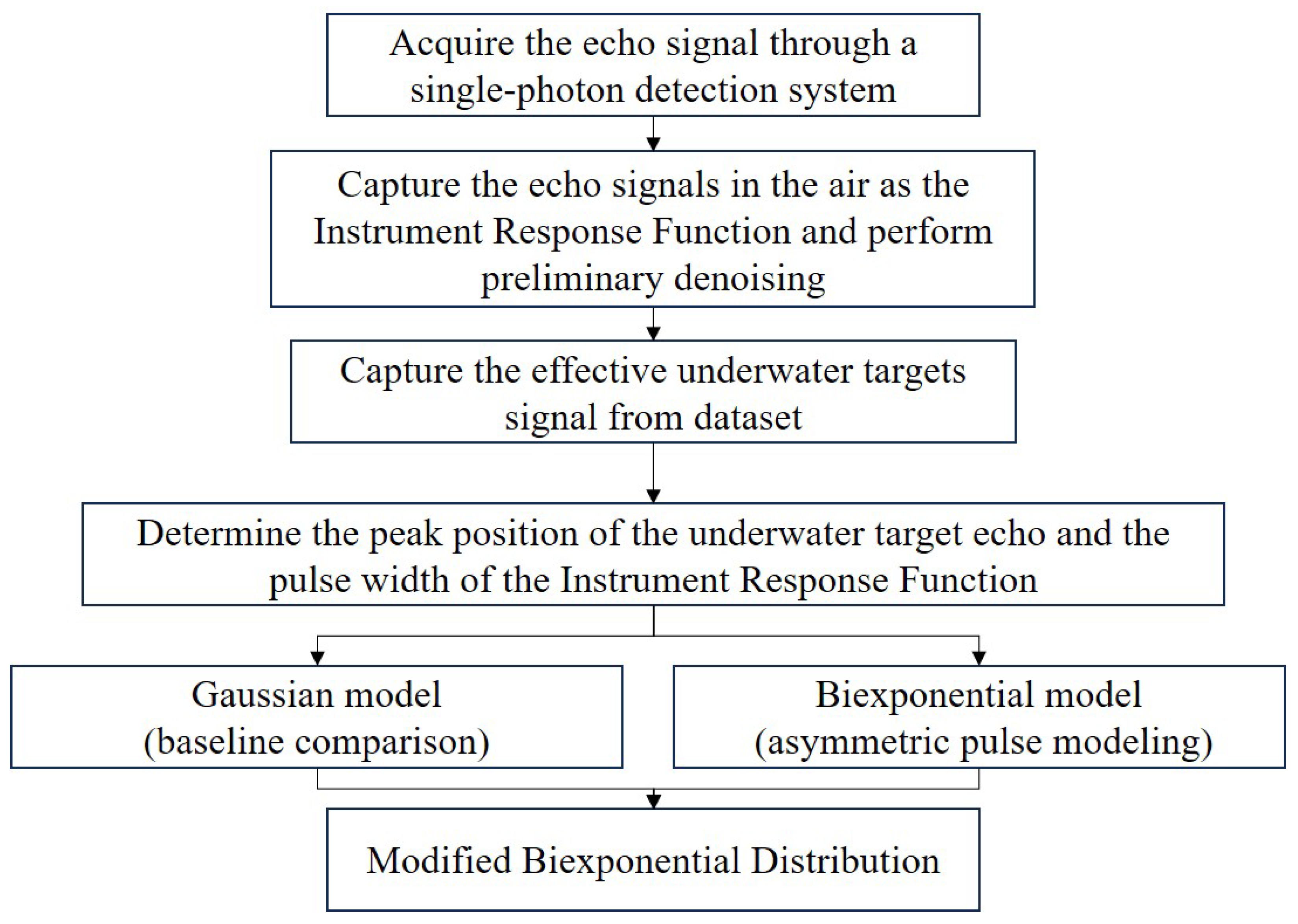 - A Modified Biexponential Distribution (MBD) model is proposed to accurately characterize the asymmetric shape of underwater single-photon LiDAR return pulses, effectively representing both sharp rising and long-tailed decay behaviors.