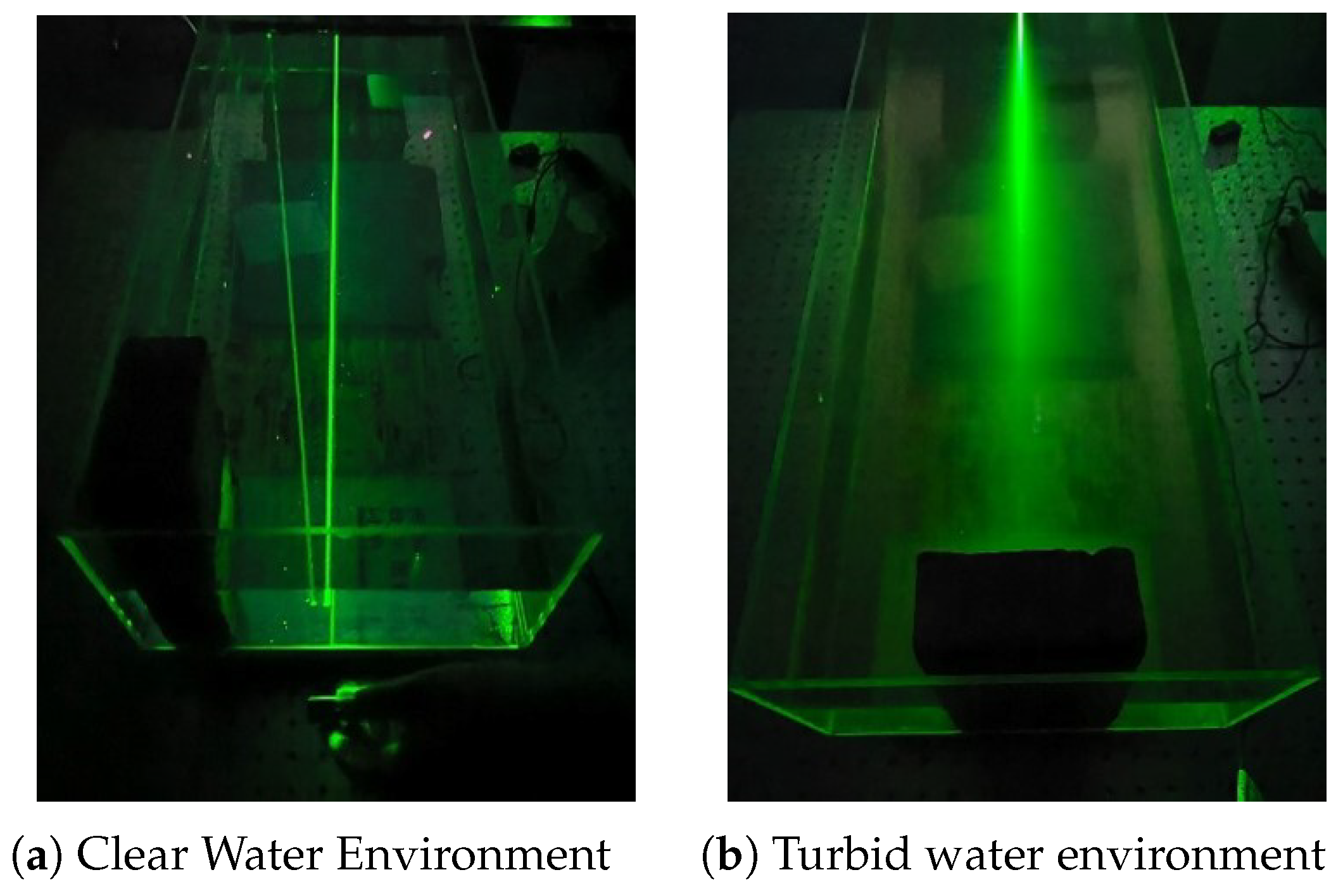 - Wang, J.; Hao, W.; Chen, S.; Xie, M.; Li, X.; Shi, H.; Feng, X.; Su, X. Underwater single photon profiling under turbulence and high attenuation environment. IEEE Geosci. Remote Sens. Lett. 2024, 21, 1–5. [Google Scholar] [CrossRef]