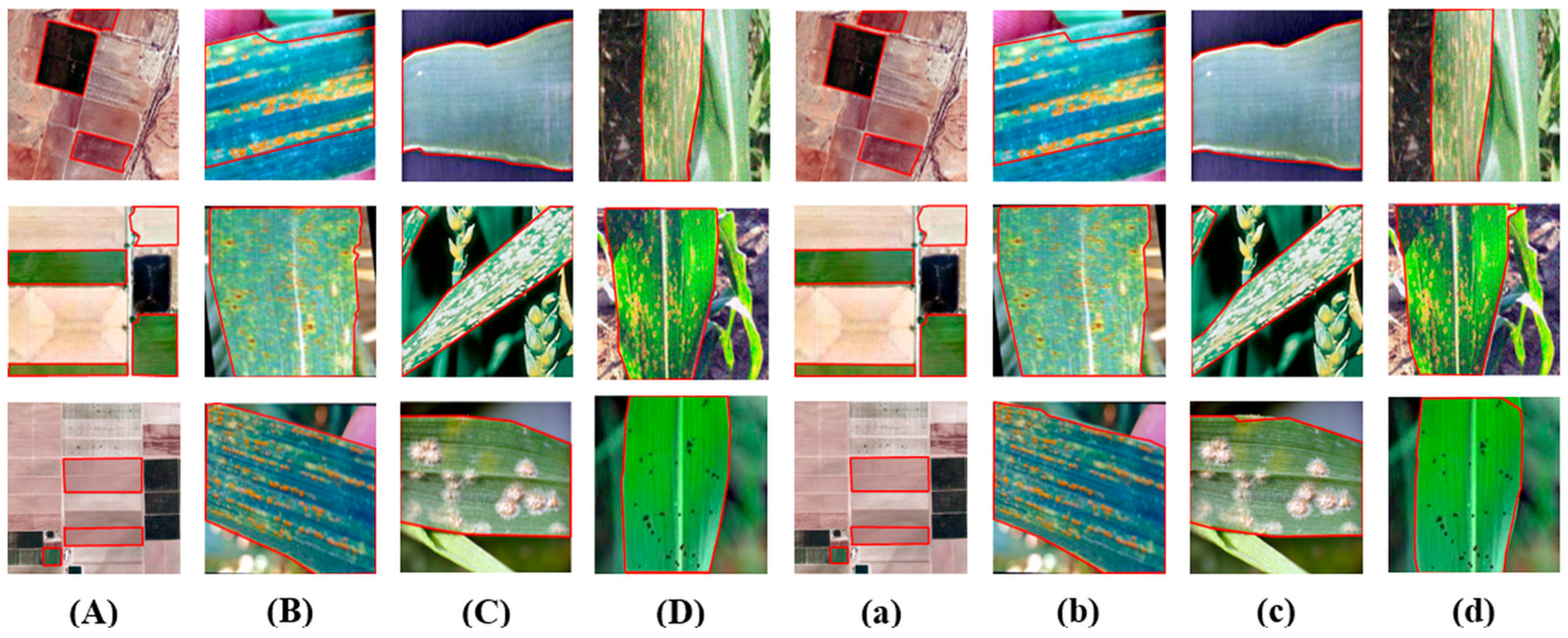 - The model demonstrates strong cross-task generalization and robustness. In the global wheat-health identification task, it achieves an mIoU of 90.20% and an mAP of 98.28%, reflecting effective knowledge transfer. Moreover, it maintains stable performance under noise-interference robustness testing, verifying its practicality in complex agricultural environments.