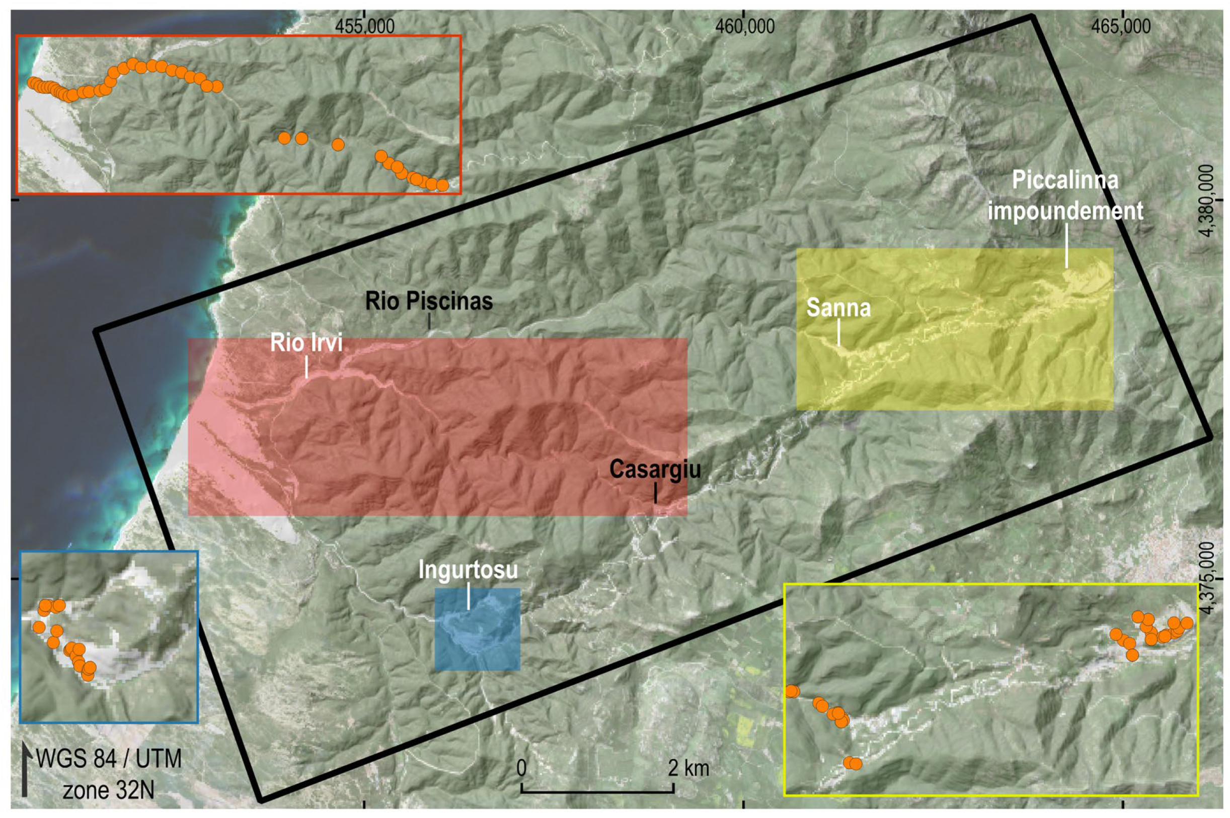 - De Giudici, G.; Medas, D.; Cidu, R.; Lattanzi, P.; Rigonat, N.; Frau, I.; Podda, F.; Marras, P.A.; Dore, E.; Frau, F.; et al. Assessment of Origin and Fate of Contaminants along Mining-Affected Rio Montevecchio (SW Sardinia, Italy): A Hydrologic-Tracer and Environmental Mineralogy Study. Appl. Geochem. 2019, 109, 104420. [Google Scholar] [CrossRef]