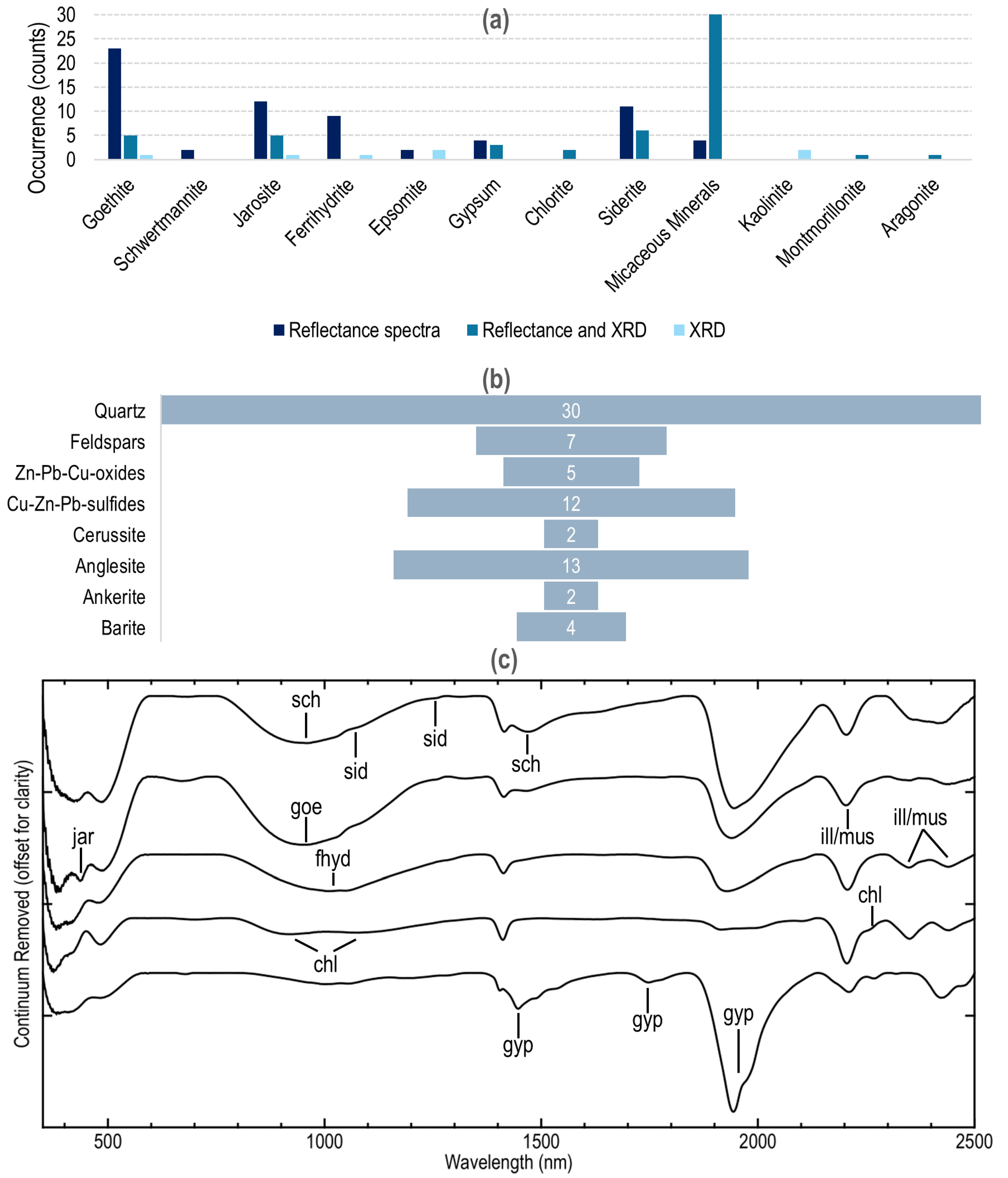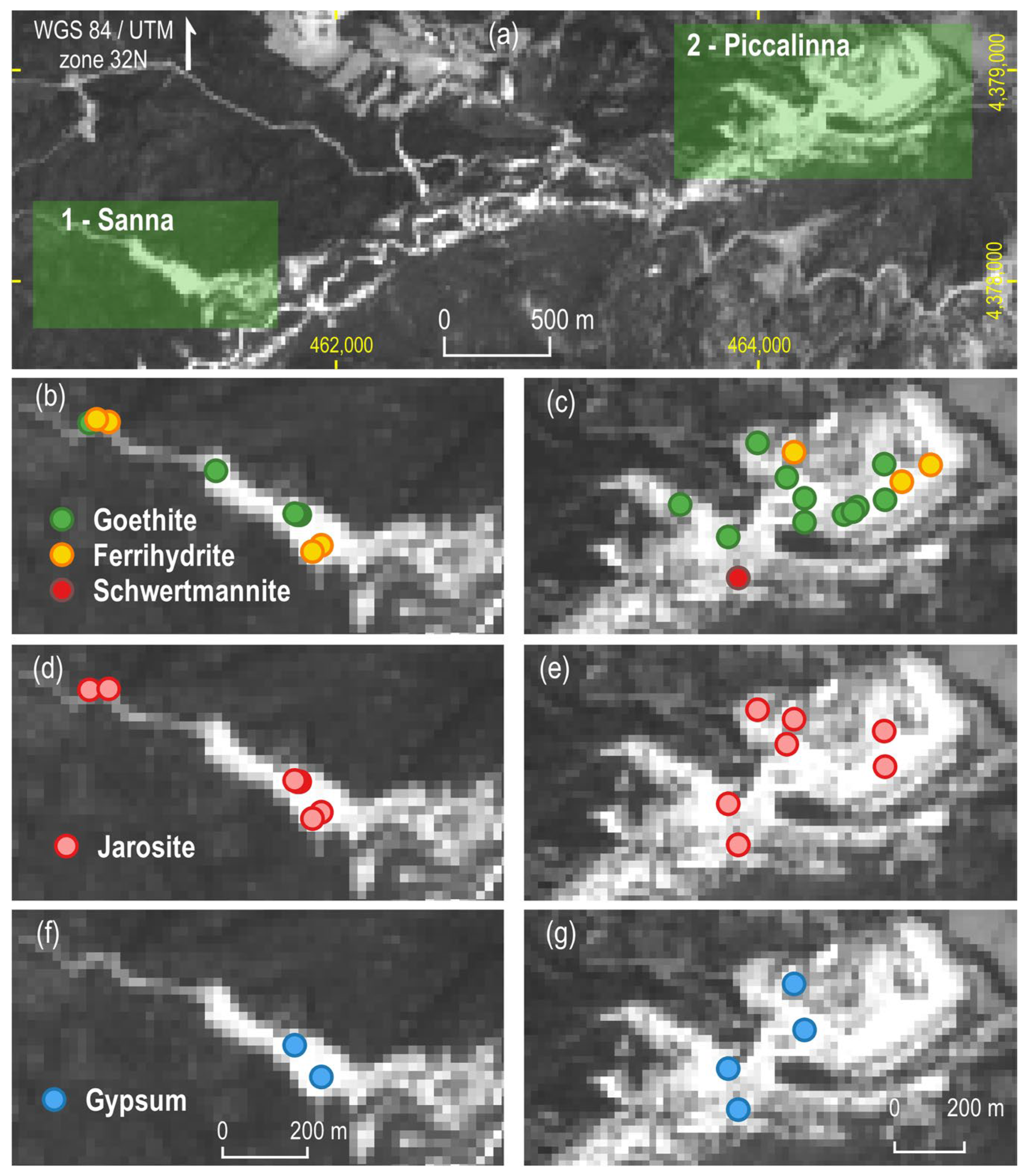 - Velasco, F.; Alvaro, A.; Suarez, S.; Herrero, J.-M.; Yusta, I. Mapping Fe-Bearing Hydrated Sulphate Minerals with Short Wave Infrared (SWIR) Spectral Analysis at San Miguel Mine Environment, Iberian Pyrite Belt (SW Spain). J. Geochem. Explor. 2005, 87, 45–72. [Google Scholar] [CrossRef]