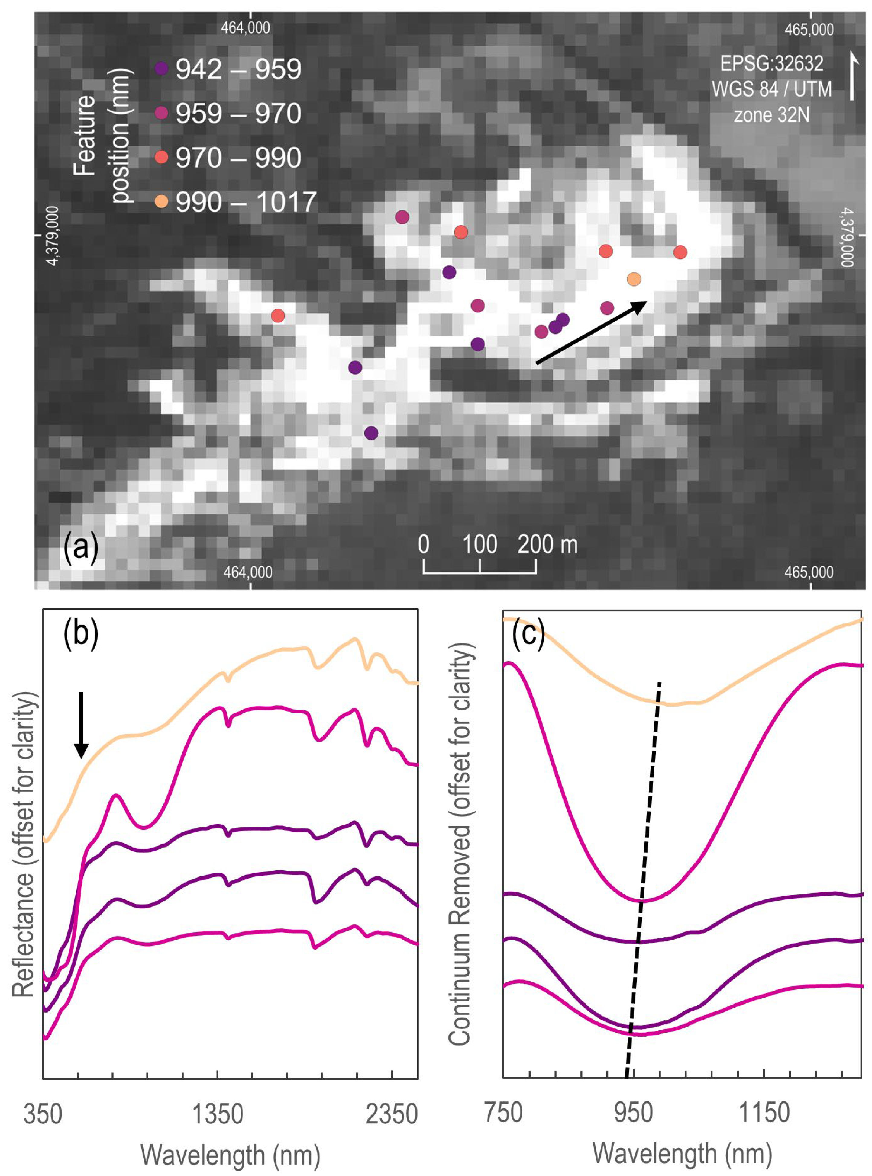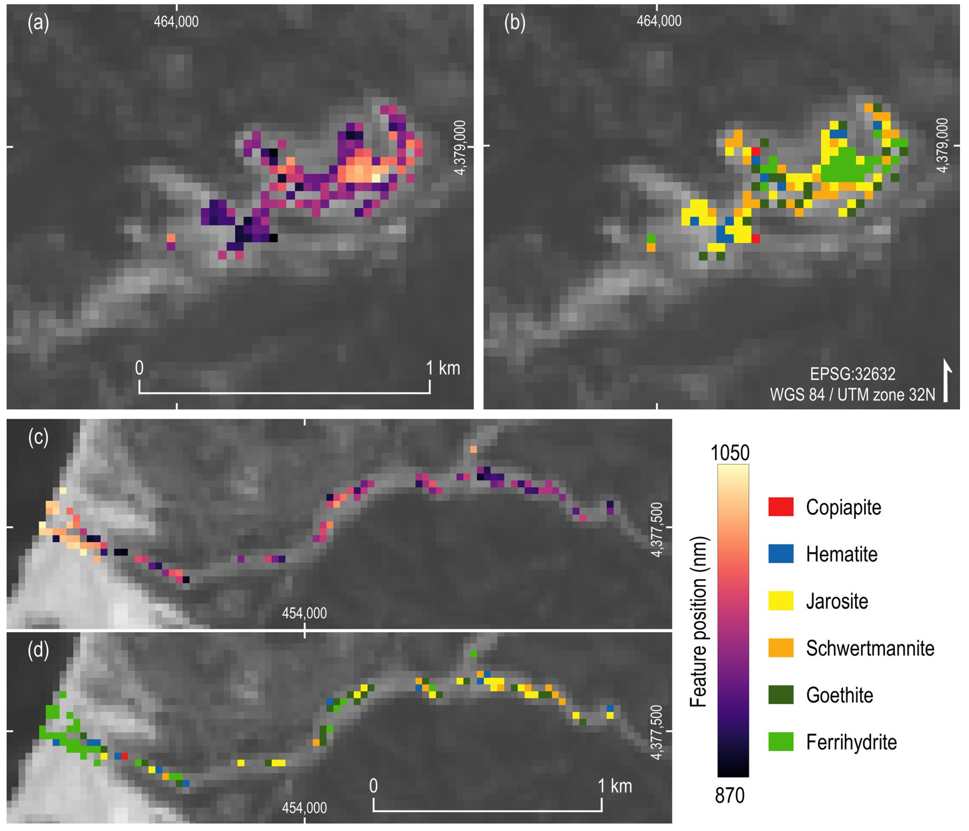 - EnMAP data can identify subtle geometrical changes in the spectral signatures of secondary minerals, which allow us to highlight areas most affected by acid mine drainage.