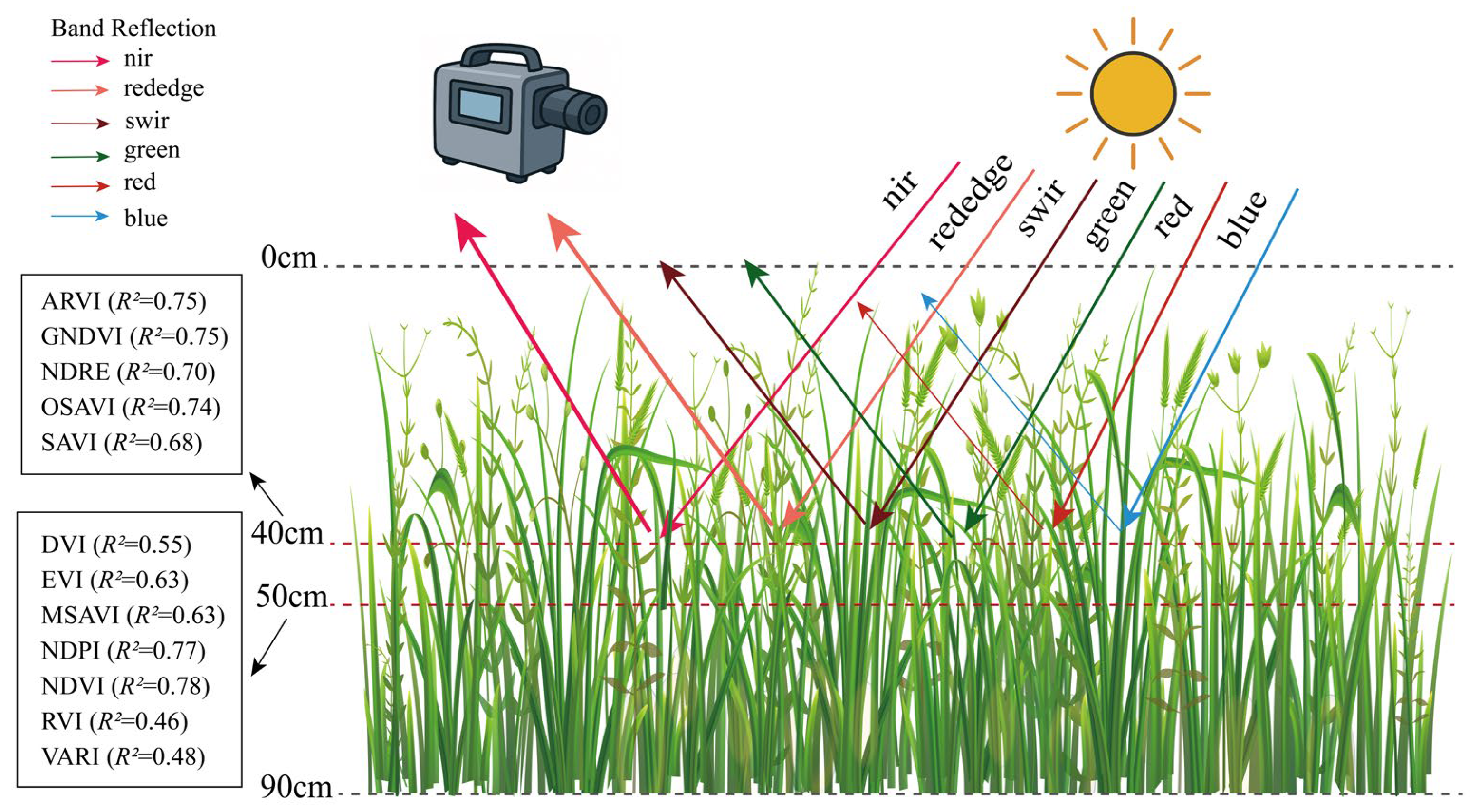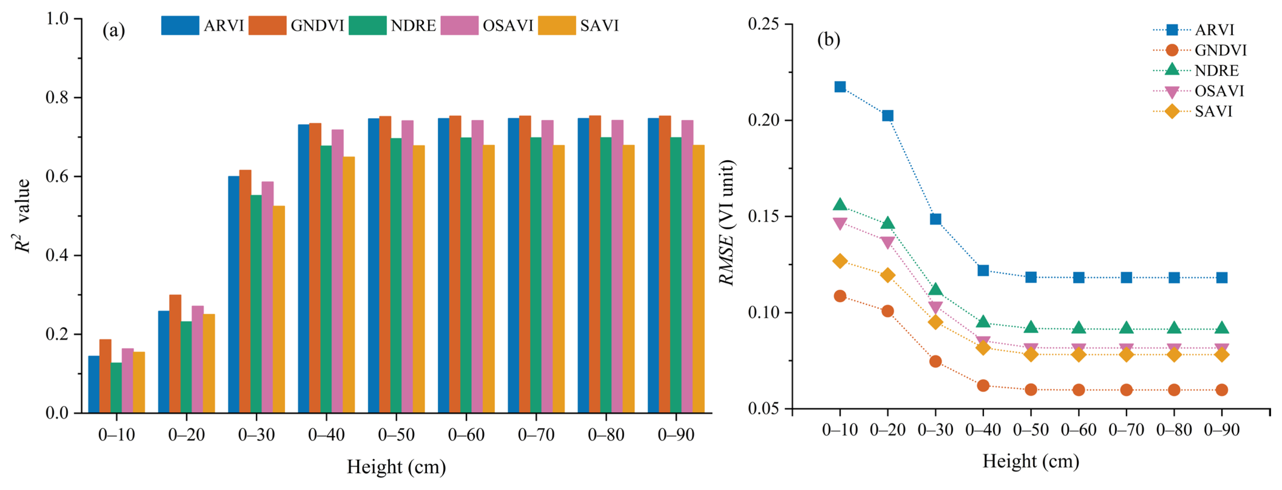- We found that the saturation of 12 vegetation indices was strongly influenced by canopy height. ARVI, GNDVI, NDRE, OSAVI, and SAVI reached saturation at a canopy height of 40 cm, whereas DVI, EVI, MSAVI, NDPI, NDVI, RVI, and VARI remained sensitive up to 50 cm, indicating stronger resistance to saturation in the latter group.