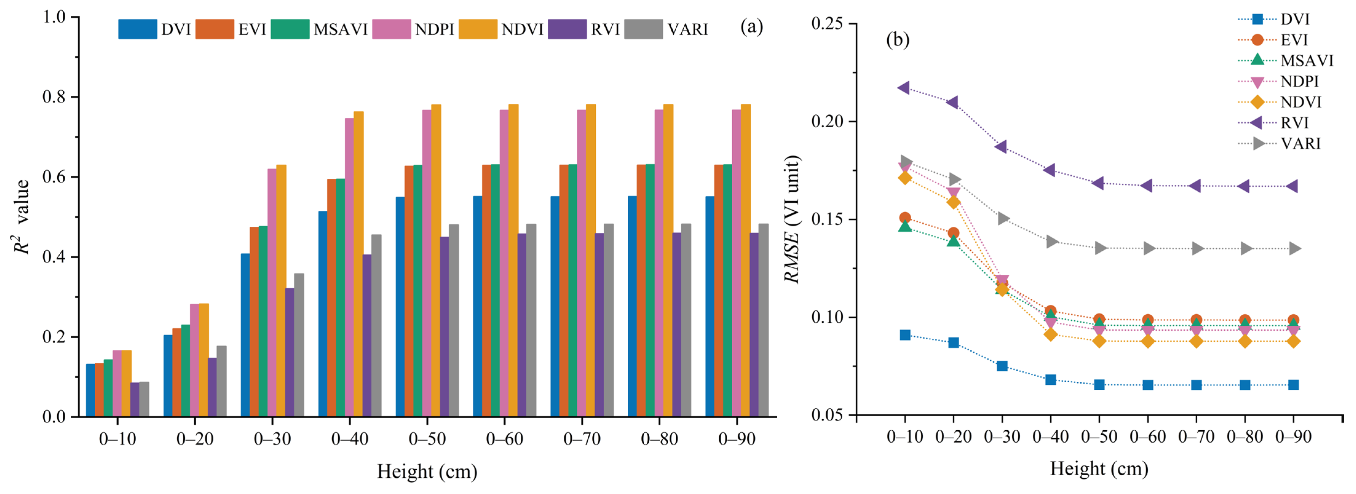 | GNDVI | −0.0006 | 40 cm | RVI | −0.0053 | 50 cm |