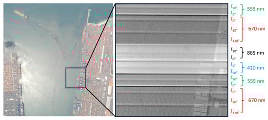 The PolCube is a 12U CubeSat, multi-angle, multi-band push-broom imaging polarimeter. It is designed to measure radiance and linear polarization at four bands: 410, 555, 670, and 865 nm, each with a full width at half maximum (FWHM) of 20 nm. Polarization states are collected at I0° and I90° for the 410, 555, and 865 nm bands, and at I0°, I60°, and I120° for the 670 nm band. By leveraging the spacecraft’s attitude control system, PolCube can capture data from four distinct viewing angles. PolCube’s required radiometric and degree of linear polarization (DoLP) uncertainties are 2% and 0.5%, respectively. Before its launch, an Engineering Qualification Model onboard an airplane (hereafter Air–PolCube), flew over two major port cities, Busan and Incheon, in South Korea from 8 to 10 May 2024. Figure 1 shows an RGB image and a sample of raw data captured during the flight over the New Port of Busan on 10 May 2024 (T 11:44 LST), with annotations on the right describing the measurement types and wavelengths. The right panel in Figure 1 illustrates how the instrument captures polarization across multiple spectral channels. The thin stripes in the raw data result from the spacing between filters for different wavelengths and polarization angles and will be removed during Level 1b data production.