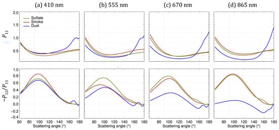 The intensity phase function (P11) and the polarized phase function (−P12/P11) show distinct patterns for different aerosol types, particularly in the backward-scattering direction. Figure 2 shows examples of P11 and −P12/P11 for sulfate, smoke (both fine-dominated; green and red, respectively), and dust (coarse-dominated; blue) aerosols at PolCube wavelengths: (a) 410, (b) 555, (c) 670, and (d) 865 nm. The −P12/P11 exhibits different scattering shapes across aerosol types and wavelengths, particularly at scattering angles between 60° and 180°. Because sun-synchronous satellites typically measure reflected radiance within this scattering angle, the −P12/P11 provides additional information for satellite-based aerosol remote sensing.