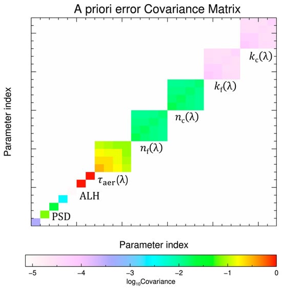 Based on the Bayesian theorem, the optimal solution at each iteration step is determined by the Levenberg–Marquardt method [40] as expressed in Equation (3). The state vector (xi) is updated to xi+1 in each iteration step with respect to the weighting function (K). The covariance matrix of measurement errors (Sϵ) is diagonal, indicating that there is no cross-correlation between the measurement errors. The damping factor (γ) controls the step size between gradient descent and Gauss–Newton methods during optimization. A priori mean state (xa) and the error covariance (Sa) are calculated by AERONET climatology [49,50] at Yonsei University in Seoul from 2011 to 2023. An example of a priori error covariance for SMART-P is illustrated in Figure 3. Wind speed is the most important forward-model parameter (b) and will be adopted from the European Centre for Medium-Range Weather Forecasts reanalysis 5 (ERA5) [51]. We assumed the uncertainty of approximately 0.5 m/s in this study.