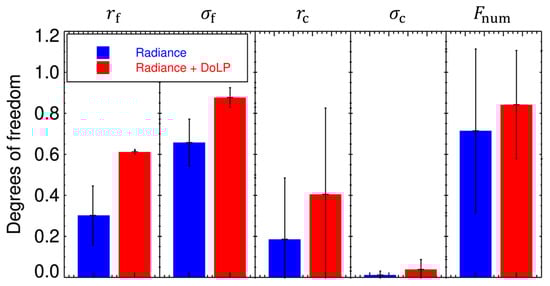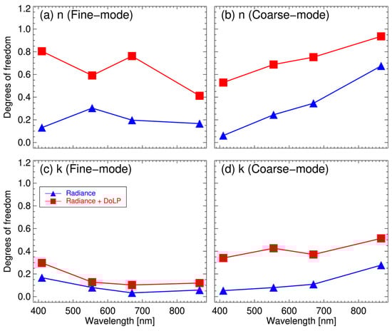 As described previously, the diagonal elements of As provide quantitative information content of each state vector, which can be expressed in terms of the degrees of freedom (df). The following Figures in Section 3.1 compare the df results for cases with and without DoLP measurements. The df with blue triangles represent results obtained from radiance measurements only, whereas those with red squares indicate results obtained from both radiance and DoLP.