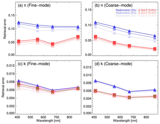 Figure 10 shows results similar to those in Figure 9, with the exception of the complex refractive indices. For this analysis, the εrets are averaged over all aerosol models. Panels (a) and (b) in Figure 10 show that retrieval accuracies for nf and nc are substantially improved when polarization measurements are used. For nf, retrieval errors are lower in the visible bands, which are more sensitive to fine-mode aerosols, than in the NIR band. By contrast, εrets for nc decrease from visible to NIR wavelengths, as NIR bands are sensitive to coarse-mode aerosols. In panels (c) and (d), including DoLP data also improves the retrieval accuracy of k in both aerosol modes. However, the improvement in k retrievals is smaller than that for n, as discussed in Figure 7. As shown in Figure 9 and Figure 10, the spectral parameters are notably influenced by the radiometric measurements and DoLP accuracies. This suggests that reliable radiometric calibrations are essential for accurate and consistent retrieval of spectral parameters.
