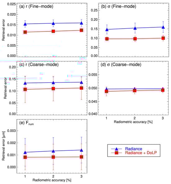 Estimated εrets, averaged over all aerosol models, for particle-size distribution parameters (rf, σf, rc, σc, and Fnum) under different radiometric and DoLP accuracies. Error bars represent the standard deviation for different aerosol types.