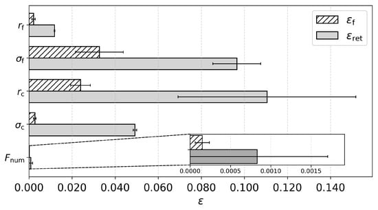 To evaluate the contribution of wind-speed uncertainties, the forward-model parameter error (εf) is compared with εret. As shown in Figure 12 and Figure 13, the hatched and gray bars indicate εf and εret, respectively. Both errors are averaged across all aerosol models and estimated for the L + DoLP case with known calibration accuracy [28]. Error bars indicate their standard deviation. Figure 12 compares εf and εret for the PSD parameters. The contribution of εf to εret is generally small across all PSD parameters. Nevertheless, it has a non-negligible impact on the retrieval of σf and rc.