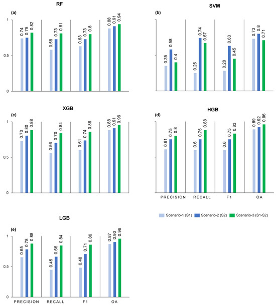 OA, F1, Recall, and Precision scores obtained for Scenario-1, Scenario-2, and Scenario-3 using RF (a), SVM (b), XGB (c), HGB (d), and LGB (e).