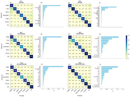 Confusion matrix obtained with all considered SU (a–c,g–i) along with the SU-selected features and corresponding PI values (d–f,j–l) with the XGB model. To improve the graphical representation, only the top 20 features with the highest PI values are shown for SU-1 (d) and SU-4 (j).