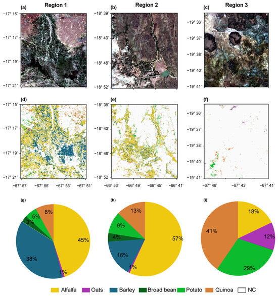 Regions 1, 2, and 3 (a–c) with corresponding crop-type maps obtained using the LGB model with SU-6 (d–f), along with the surface extent of the detected crop-types (g–i).