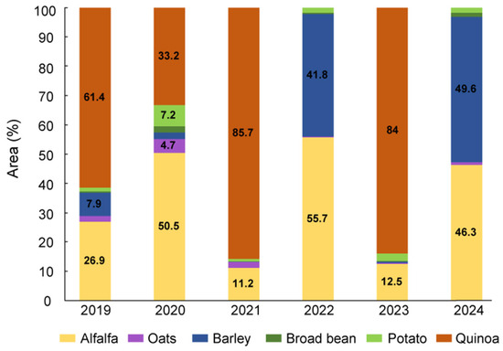 Figure 6 shows the crop-type surface extent time evolution for the 2019–2024 period in Region 4 (see Figure 1b), as observed by the LGB model with SU-6. In this region, quinoa, alfalfa, and barley account for the main crop-type activities, with their cumulative surface area collectively exceeding 80%. An interesting pattern of crop rotation between quinoa, alfalfa, and barley emerge, where an increase in quinoa cultivation corresponds to a decrease in alfalfa area, and vice versa. Notably, quinoa was replaced by barley in the 2022 and 2024 growing seasons. Despite the fact that such rotations are a standard agricultural practice in the Altiplano to prevent monoculture and to maintain soil fertility, this observation has to be considered with caution. Actually, the crop-type spectral signature varies along time due to crop development sensitivity to climate conditions (i.e., rainy season onset/offset, heat/cold waves). As the model was calibrated for a specific year (2022) with inherent crop-type development, misclassification among the crop types may occur along the considered time span (2019–2024), introducing uncertainties in the temporal analysis.