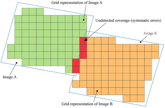- Discrete Grid-Based Methods: Subsequent research primarily discretizes the ROI into regular grids or point sets, thereby transforming the intrinsically difficult continuous optimization problem into the more fundamental, versatile, and well-established SCP, which has mature solution algorithms. For example, Chu et al. [39] designed fitness scores and utilized genetic algorithms to optimize remote sensing image selection; Tao et al. [16] established a Markov random field model to optimize greedy algorithm results; Li et al. [15] applied a greedy algorithm to obtain a locally optimal initial solution, then combined weighted gain-loss strategies and improved local search mechanisms to seek the optimal solution; Yang et al. [14] utilized ray projection and greedy algorithms to optimize image selection for Sentinel-1 data. However, discretization introduces an inherent contradiction: coarse grids (larger cells) lead to inaccurate boundary representation, unable to accurately represent the spatial relationship between images and the ROI. When image boundaries intersect with grid cells, the entire cell is typically marked as fully covered or fully uncovered, causing systematic errors (as shown in Figure 1). This leads to repeated selection near image boundaries—adjacent images may be selected to cover the same partially covered cell. Fine grids (smaller cells), while improving boundary accuracy, significantly increase computational complexity. The number of grid cells grows quadratically with increasing grid precision, while the SCP solution time typically grows super-linearly with problem scale. For continental-scale applications with millions of candidate images, fine grid discretization becomes computationally prohibitive.