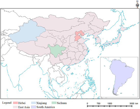 To comprehensively evaluate the scale adaptability and robustness of the SCOPES framework, this study selected five regions of different scales as study areas: Hebei, Sichuan, Xinjiang, East Asia and South America (Figure 2). The first three regions correspond to Chinese provincial administrative divisions, while the East Asia region spans multiple countries, representing a larger and more complex cross-regional geographical context. To further verify the sensor generalization capability of the framework, this study specifically introduces an experimental region in South America based on the Landsat data source. These regions cover a wide range from local to continental scales, providing a solid foundation for comprehensively validating the framework’s performance in large-scale, complex geometric contexts.