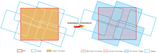 The redundancy elimination strategy is based on spatial Boolean overlay analysis, precisely decomposing the union of image footprints in the preliminary result into non-overlapping atomic polygon units . Based on the number of covering images for each atomic polygon , image necessity can be determined. Specifically, if , the atomic polygon is covered by only one image, and that image is determined to be a necessary image. The necessary image set satisfies