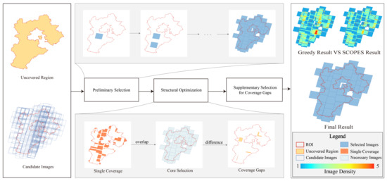 - SCOPES framework operates directly on image footprints in continuous space, employing a three-stage strategy (preliminary selection–structural optimization–supplementary selection) with lazy greedy algorithm, spatial Boolean overlay, and incremental gap repair to achieve efficient, low-redundancy image selection.