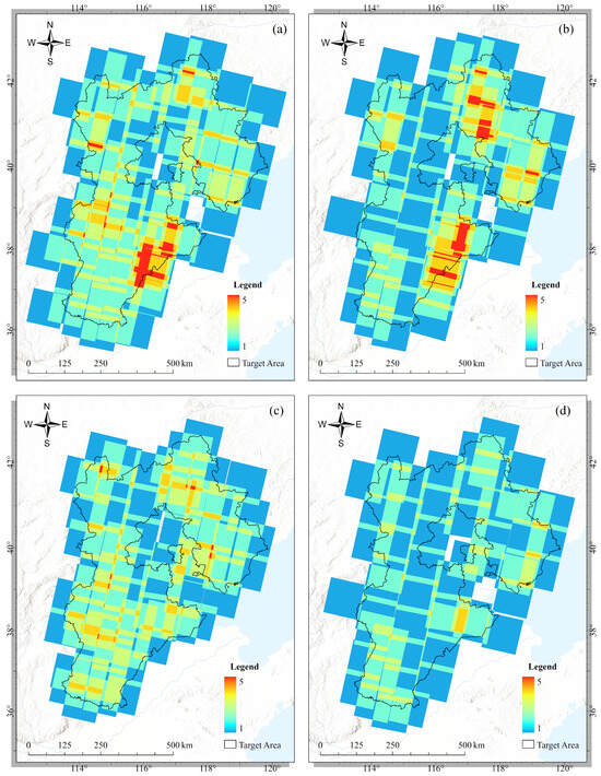 In addition to metadata-driven methods, some studies have also explored area coverage optimization and mosaicking by directly utilizing image content. Kempeneers and Soille [25] optimized Sentinel-2 image selection using quicklook-based evaluation in a big data environment; Yu et al. [12] developed a multi-temporal orthoimage mosaicking method based on dynamic variable patches; Pan et al. [26] proposed a full-coverage image selection method based on deep learning quality grading. These methods highlight the potential of content-based strategies in improving coverage and mosaic quality. However, because they require geometric and radiometric correction of all candidate images, the computational cost becomes prohibitive in large-area studies. Metadata-driven area coverage selection can alleviate this burden by reducing the number of images requiring such expensive preprocessing, thereby supporting more efficient use of content-based mosaicking methods.